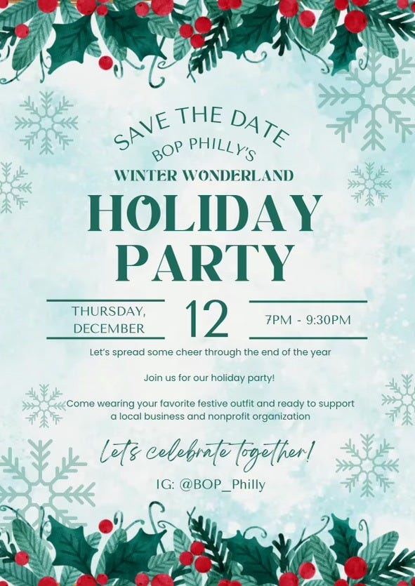If you’re Philly based, I have the perfect opportunity to get started! Join me at Fergie’s Pub in Center City on Thursday, December 12th from 7-9:30pm. I am co-hosting a Holiday Party & Food Drive with my friend Siah McCabe and her community collective, BOP Philly. We will be supporting local nonprofit Small Things Philly. Small Things distributes food, hygiene, and household goods to a network of local partners comprised of community centers, food pantries, and churches in and around Philadelphia.